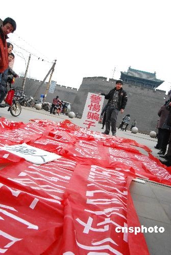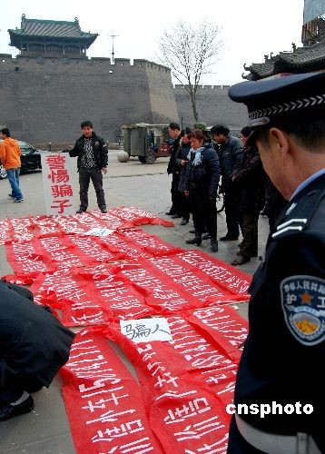 2009年3月1日,山西平遙古城,一小伙兒手持“警惕騙子”木牌,展示收繳的“低價(jià)售小車(chē)”廣告條幅在街頭展示。據(jù)了解,該小伙姓王,幾天前看了懸掛在墻頭的條幅廣告購(gòu)買(mǎi)二手私家車(chē),不想錢(qián)匯了,車(chē)卻沒(méi)有到手。為了不讓其他人再上當(dāng)受騙,他上街四處清理這些騙人的條幅廣告,并在街頭公然向騙子宣戰(zhàn):“騙子掛一幅,我就撕一幅,決不能讓它再騙人。”中新社發(fā) 梁寶海 攝