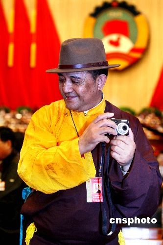 全國政協(xié)十一屆二次會(huì)議3月3日下午在人民大會(huì)堂開幕,一名少數(shù)民族委員拿著相機(jī)在大會(huì)上捕捉精彩瞬間。中新社發(fā) 宋吉河 攝