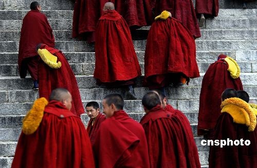 3月4日,中國藏歷新年正月初八,西藏拉薩哲蚌寺舉行傳昭大法會(huì),該寺僧人辯經(jīng)結(jié)束后進(jìn)入措欽大殿。中新社發(fā) 廖攀 攝