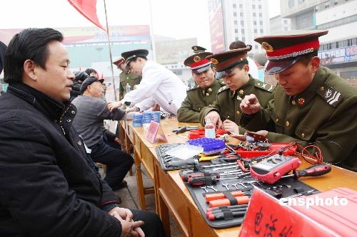 3月5日,青年志愿者在蚌埠火車站廣場參加“學(xué)雷鋒”獻(xiàn)愛心便民服務(wù)活動。當(dāng)日是全國“學(xué)雷鋒日”,共青團(tuán)安徽蚌埠市委舉行了“爭做志愿者、創(chuàng)造新生活”為主題的志愿服務(wù)統(tǒng)一行動,部隊(duì)、機(jī)關(guān)、學(xué)校、醫(yī)院、企業(yè)等二十多個單位組成多個青年志愿便民服務(wù)隊(duì),深入駐地農(nóng)村、街道、社區(qū)、敬老院、兒童福利院等地,積極開展醫(yī)療巡診、法律咨詢、計(jì)生宣傳、心理咨詢、環(huán)保宣傳、家電維修、安全消防、用電知識等多種服務(wù)活動。中新社發(fā) 耿國慶 攝