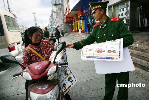 3月5日是中國(guó)“學(xué)雷鋒日”,西藏消防總隊(duì)的官兵在拉薩市北京中路向過(guò)往市民發(fā)放消防宣傳畫和講解消防知識(shí)。中新社發(fā) 劉震 攝