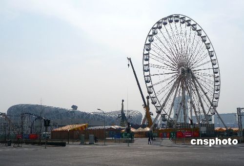 2009年3月10日,在北京奧林匹克公園“鳥(niǎo)巢”東北角,摩天輪、海盜船、太陽(yáng)神車等在內(nèi)的娛樂(lè)設(shè)施已經(jīng)搭建完畢,目前正在加緊調(diào)試中,預(yù)計(jì)將于本月中旬開(kāi)業(yè)迎客。據(jù)悉,此次嘉年華不同于前幾年舉辦的環(huán)球嘉年華活動(dòng),包括包括海盜船等在內(nèi)的40個(gè)機(jī)動(dòng)游樂(lè)項(xiàng)目和56個(gè)競(jìng)技游樂(lè)項(xiàng)目會(huì)給游客耳目一新的感覺(jué),而且隨著季節(jié)的更替和游客喜愛(ài)程度的不同,這些大型游樂(lè)設(shè)施會(huì)定期替換。中新社發(fā) 玉龍 攝
