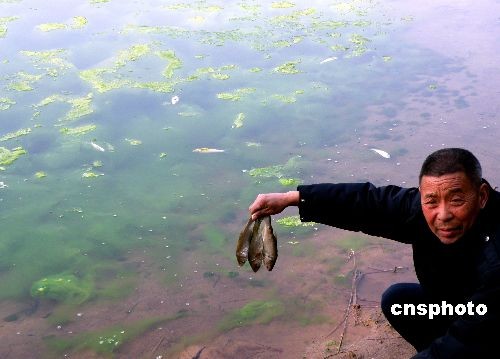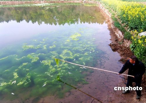 2009年3月10日,湖北省荊門市掇刀區(qū)麻城鎮(zhèn)胡沖村農(nóng)民鄭家清承包的魚塘暴發(fā)藍藻,導(dǎo)致不久前投放的價值2000多元的魚苗缺氧成批死亡。據(jù)鄭家清稱,他承包的16畝魚塘近幾年來在春夏時節(jié)不同程度的暴發(fā)藍藻,需要用藍礬(五水硫酸銅)才能將藍藻滅掉。中新社發(fā) 劉君鳳 攝