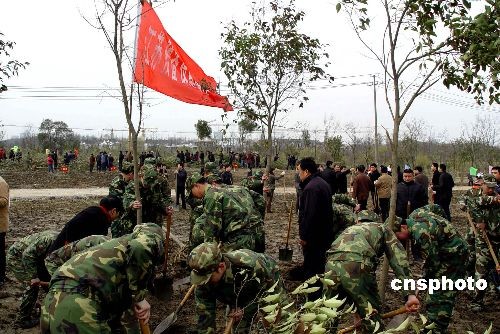 3月11日上午,植樹節(jié)即將到來之際, 江蘇省揚州市開展全民義務(wù)植樹活動。江蘇某預(yù)備役高炮師組織官兵到駐地參加義務(wù)植樹。圖為官兵在同當(dāng)?shù)厥忻窆餐N下白玉蘭樹。中新社發(fā) 田亞威 攝