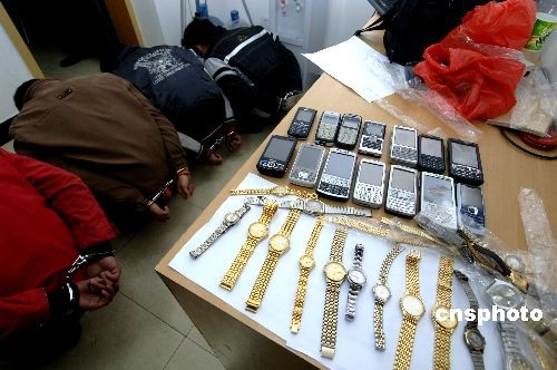 三月十二日,一伙盜竊分子在福州臺江刑偵大隊背對贓物,準備接受審問。福州警方近日破獲一起盜竊團伙案,八名四川籍犯罪嫌疑人因撬開沿街商鋪盜竊名表、手機、電腦等貴重物品被捕。中新社發(fā) 王東明 攝