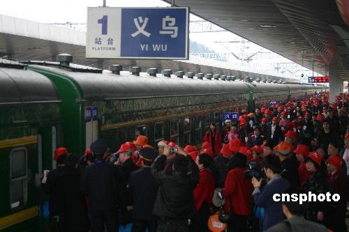3月12日下午,大陸首個火車專列赴臺旅游團從浙江義烏出發(fā)。千余名大陸游客將通過火車專列至廈門,渡海過金門后乘飛機赴臺灣旅游。據組織者浙江中旅出境中心總經理曹軍介紹,這也是大陸赴臺旅游人數最多的單個團隊,本月14日和4月初將還有2000多名游客通過這一方式赴臺旅游。中新社發(fā) 王旻 攝