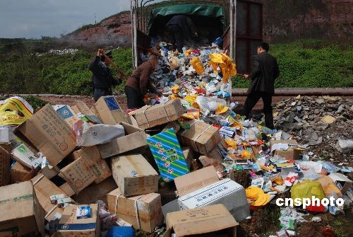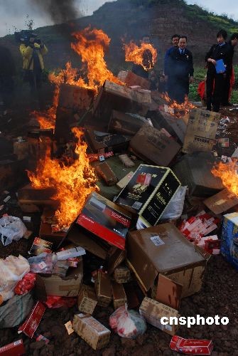 3月13日,重慶市璧山縣工商、質監(jiān)、煙草等相關部門將收繳的假冒偽劣商品集中銷毀。據悉,此次被銷毀的偽劣商品有化妝品、日用品、假煙、假酒等539個品種。中新社發(fā) 謝捷 攝