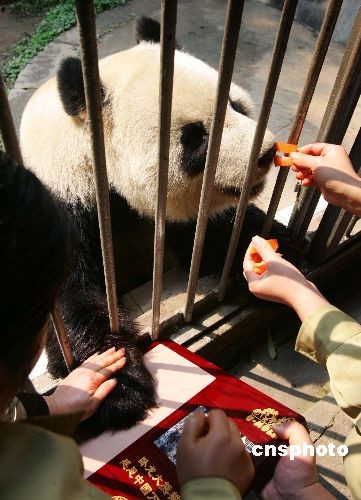 三月十三日上午,福州熊貓世界中心四只來自地震災(zāi)區(qū)的大熊貓,在特制模盤里各自踩下一個彌足珍貴的“掌印”。這四個“掌印”將作為大熊貓萬里行感恩活動的見證,送往四川臥龍大熊貓研究中心,作為永久留念保存。中新社發(fā) 楊婀娜 攝