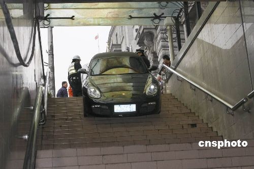 三月十三日下午一點(diǎn)左右,一輛保時(shí)捷豪華跑車(chē),誤打誤撞駛?cè)肷虾!巴鉃┦颂?hào)”著名老建筑門(mén)前的“南京東路人行地道”內(nèi),女司機(jī)在發(fā)現(xiàn)是人行通道后趕緊剎車(chē)。在搶險(xiǎn)過(guò)程中,一名上前幫忙牽引的工人被擠壓成重傷。中新社發(fā) 宣克炅 攝