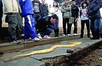 中新網(wǎng)3月15日電 湖南杜甫江閣北邊江邊趴著一條金黃色的蟒蛇,這條蟒蛇長(zhǎng)約1.5米,有成年男子手臂那么粗,蛇皮呈金黃色,有些微微的腫脹,好像被水浸泡過(guò),看上去似乎已經(jīng)死了,很多群眾自發(fā)地把現(xiàn)場(chǎng)保護(hù)起來(lái)。