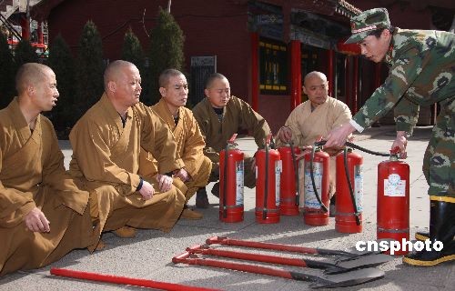 2009年3月17日,山西省盂縣永清寺院內(nèi),消防戰(zhàn)士在向僧人講解滅火器的正確使用方法。當(dāng)日,盂縣消防大隊(duì)開(kāi)展“消防安全進(jìn)寺廟”活動(dòng),消防戰(zhàn)士深入寺廟,手把手教僧人使用消防器材,現(xiàn)場(chǎng)培訓(xùn)僧人在火災(zāi)發(fā)生后第一時(shí)間內(nèi)協(xié)助消防員進(jìn)行救援、緊急疏散的技能。中新社發(fā) 程瑜 攝