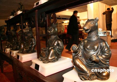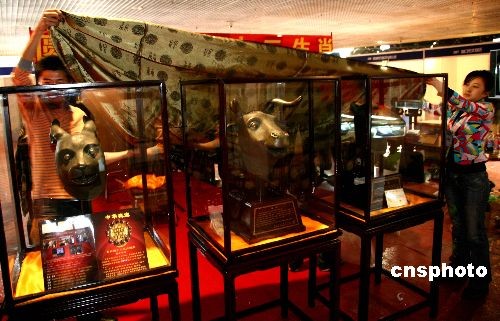 3月18日,圓明園獸首在第七屆全國(guó)工藝品、旅游品、禮品博覽會(huì)上亮相。當(dāng)日,第七屆全國(guó)工藝品、旅游品、禮品博覽會(huì)在大連星海會(huì)展中心展出,圓明園十二生肖獸首精仿品亮相。這次展出的獸首分全套縮小比例展品部分和全套人身獸首縮小比例部分,其中,牛首、兔首和鼠首均是按照實(shí)物1:1比例設(shè)計(jì)制作的。中新社發(fā) 徐德武 攝
