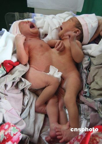 3月18日,躺在湖南省新化縣中醫(yī)院婦產(chǎn)科內(nèi)的連體嬰兒。16日,湖南省婁底市新化縣石沖口鎮(zhèn)紅寨村28歲的段曉艷在新化縣中醫(yī)院剖腹產(chǎn)下該市首例連體嬰兒。連體嬰兒都是女?huà)耄w重4.8公斤。面對(duì)這對(duì)連體女?huà),段曉艷一家人憂心忡忡,不知后期手術(shù)費(fèi)用如何籌措。目前,連體嬰兒已得到了首筆1000元的捐款。18日,湖南省兒童醫(yī)院的醫(yī)生將連體嬰兒接去長(zhǎng)沙市治療。 中新社發(fā) 郭國(guó)權(quán) 攝