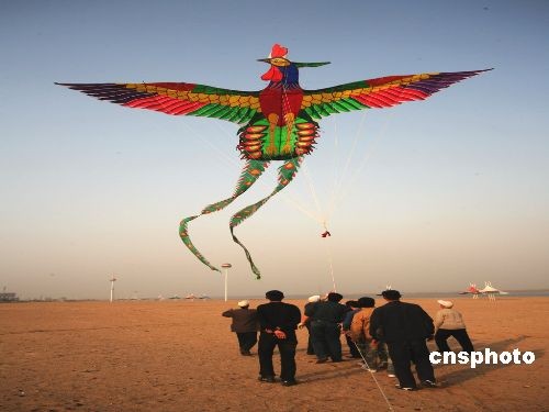 3月18日下午,一只巨型鳳凰風箏在臨沂城區(qū)段沂河岸邊起飛,引來許多市民觀賞 。這只風箏由臨沂鳶友俱樂部楊寶玉主任設計并同風箏愛好者耗時兩個多月制作完成。該風箏長65.8米,雙翅展距20.4米,用碳素鋼管和防雨綢扎制,是目前世界上軟翅類最大的風箏,他們準備在4月份攜帶該風箏參加第26屆濰坊國際風箏節(jié),一展臨沂風箏愛好者風采。 中新社發(fā) 梅魯生 攝