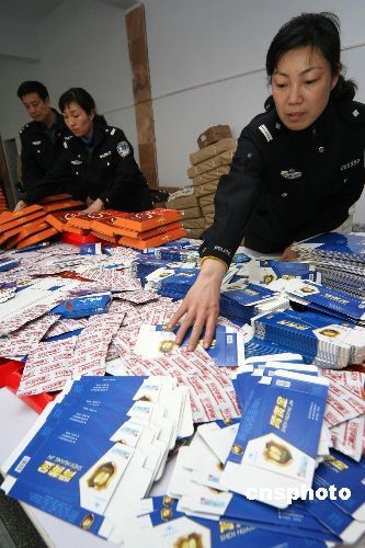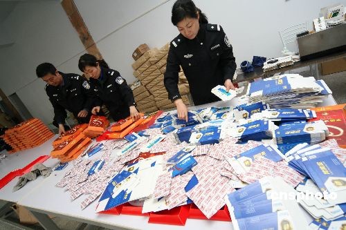 3月18日,河南許昌市魏都公安分局民警在涉嫌制造假藥窩點(diǎn)統(tǒng)計(jì)查獲的假藥及藥品標(biāo)簽、藥盒等。當(dāng)日,魏都警方接群眾舉報(bào),在一閑置廠房?jī)?nèi)查獲涉嫌制造假藥窩點(diǎn),當(dāng)場(chǎng)查扣涉嫌假冒藥品10多種,半成品藥品、包裝箱、合格證、防偽標(biāo)識(shí)等1000多件,涉案值達(dá)2000余萬元。假冒藥品有五豆平糖膠囊、腎金子、腎黃金、協(xié)和降脂等10多種,藥效包含降壓、減肥、壯陽(yáng)滋補(bǔ)等。藥品的制假技術(shù)很高,須借助儀器檢測(cè)才能區(qū)別。此案正在進(jìn)一步調(diào)查處理中。中新社發(fā) 牛書培 攝