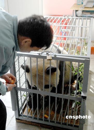 3月22日,在北京動(dòng)物園生活了9個(gè)月的8只奧運(yùn)大熊貓開始起程返回四川老家。臨行前,工作人員正在喂大熊貓食物,并依依不舍為其送行。中新社發(fā) 鄭雄增 攝