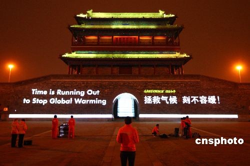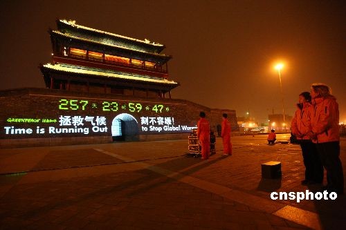 3月23日,在世界氣象日當(dāng)天,國(guó)際環(huán)保組織綠色和平在北京永定門(mén)城樓啟動(dòng)拯救氣候倒計(jì)時(shí)活動(dòng),希望藉此傳達(dá)世界變暖已經(jīng)迫在眉睫的危機(jī)感。2009年12月,聯(lián)合國(guó)氣候變化會(huì)議將在丹麥?zhǔn)锥几绫竟e行,屆時(shí)各國(guó)領(lǐng)導(dǎo)人將就未來(lái)應(yīng)對(duì)氣候變化的全球行動(dòng)簽署協(xié)議。這將是繼2005年生效的《京都議定書(shū)》后又一具有劃時(shí)代意義的全球氣候協(xié)議書(shū),將對(duì)地球未來(lái)的氣候變化產(chǎn)生重要影響。中新社發(fā) 富田 攝