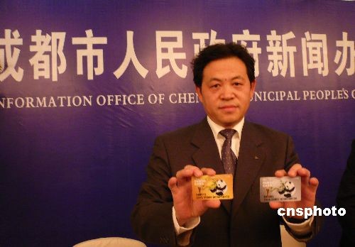 圖為成都市政府副秘書長鄧工力向媒體介紹發(fā)行的熊貓金卡和銀卡。3月24日,成都市將在成都11個(gè)景區(qū)對(duì)持有熊貓金卡的游客(配合本人身份證使用)實(shí)行免門票,對(duì)省內(nèi)持熊貓銀卡的游客實(shí)行門票半價(jià)優(yōu)惠。這次對(duì)省外游客發(fā)放熊貓金卡1500萬張,省內(nèi)發(fā)放熊貓銀卡500萬張。門票減免時(shí)間為即日到今年12月31日止。中新社發(fā) 王俊 攝