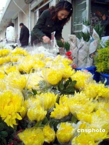 3月24日,顧客在蘇州市養(yǎng)育巷一家花店選購祭祀菊花。隨著清明節(jié)的臨近,蘇州鮮花市場上菊花、百合等花卉熱銷,不少蘇州市民選擇用鮮花替代元寶蠟燭祭奠親人,樹立文明祭拜新風(fēng)。中新社發(fā) 王建康 攝