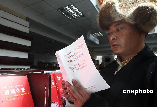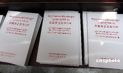 3月25日,紀(jì)念西藏民主改革50周年獻(xiàn)禮圖書首發(fā)式在拉薩舉行。藏文版《西藏民主改革50年》白皮書在拉薩首發(fā)。中新社發(fā) 杜洋 攝