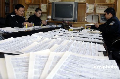 北京豐臺警方經(jīng)縝密偵查,近日一舉將一個用電話進行詐騙的特大犯罪團伙打掉,15名嫌犯全部落網(wǎng)。警員正在整理該團伙從網(wǎng)上購買的個人信息。中新社發(fā) 楊陽 攝