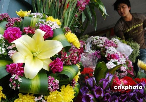 3月26日,在福建泉州風俗掃墓的第一天,市區(qū)花店收到了許多簡易花圈的訂單。在金融危機的大形勢下,市民放棄以往奢華的花籃花圈,大多挑選簡易花束、花圈祭祖。中新社發(fā) 傅丹丹 攝