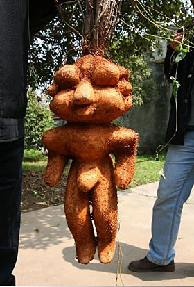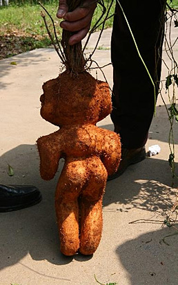 3月25日,江西省上高縣蒙山鄉(xiāng)陂下村一農(nóng)民在野外取土時,挖出一株根部酷似男性 “人形”神奇植物。該株“人形”植物長約1.25尺(41.6厘米),寬約18厘米,重量約4公斤,人體特征齊全,發(fā)、眼、鼻、耳、嘴、手、腳及男性的生殖器均分明逼真,實屬罕見。據(jù)當?shù)乩现嗅t(yī)和藥品檢驗人員初步鑒定,其為野生何首烏,生長年限至少在百年左在。其型狀最為逼真、體株最大的何首烏在當?shù)剡未發(fā)現(xiàn)過。