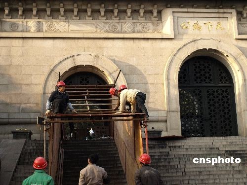 據(jù)南京市中山陵園管理局消息,為迎接孫中山奉安大典80周年,南京市近日投資300多萬元啟動中山陵主體建筑維修工程。據(jù)了解,這也是自新中國成立近60年來,中山陵第二次大規(guī)模維修,上次規(guī)模較大的維修是在1982年。“吾死之后,可葬于紫金山麓,因南京為臨時政府所在地,所以不忘辛亥革命也!弊裾諏O中山先生的遺愿,中山陵于1926年春開始修建,至1929年建成,當年6月1日,中山先生的靈柩奉安于此。 中新社發(fā) 楊潔 攝
