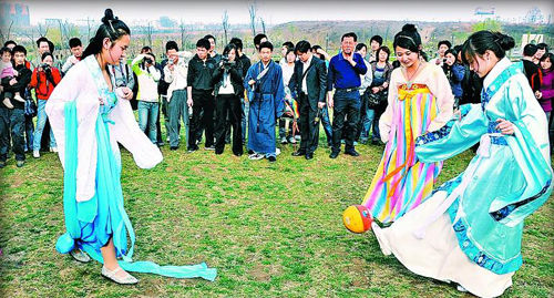 3月29日,農(nóng)歷三月三上巳節(jié),是中國傳統(tǒng)的“女兒節(jié)”。西安一群愛好漢服的女子來到唐城墻遺址公園的吟詩壇里秀風(fēng)采。幾個女孩子以古代名畫《女史箴圖》為藍本,以情景劇形式表現(xiàn)中國古代貴婦的妝容文化。旁邊還配有專業(yè)人士指導(dǎo)并現(xiàn)場解說,向大家介紹中國古代婦女的妝容。隨后,她們又到曲江池遺址公園湖邊,舉行祓禊祈;顒,并踢起了球。