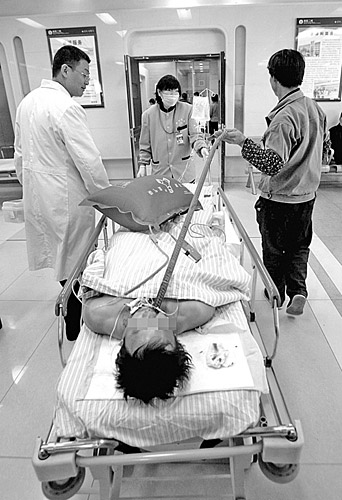 后,傷員被推進(jìn)了CT室,先要看看鋼筋頭的位置,醫(yī)生告訴記者,鋼筋還不能拔,一拔就沒救了,那可是根直徑2厘米的鋼筋。