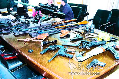 4月3日,青山警方在查處一起涉毒案件時(shí)獲得線索,在紅鋼城三街坊陳某家中,搜出手槍、機(jī)關(guān)槍、沖鋒槍、狙擊步槍等仿真度極高的槍支13支,還有一批管制刀具。警方認(rèn)定,這些仿真槍具有殺傷力。