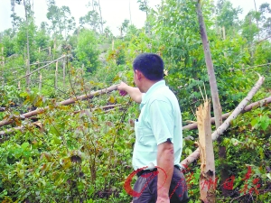 昨日(16日)凌晨2時許,一股強勁的龍卷風(fēng)卷著冰雹突襲了臺山市廣海鎮(zhèn)中興村委會一帶。所到之處損毀嚴重,數(shù)千畝山林遭腰斬,村中40多畝的冬瓜棚全部坍塌,部分瓦房被龍卷風(fēng)卷著的冰雹“開”了天窗。