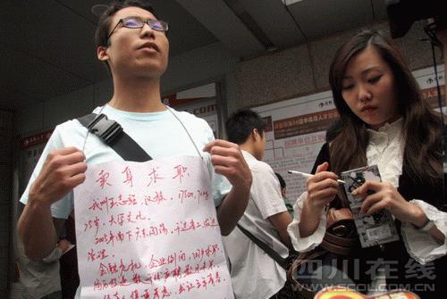想找份好工作,就要學(xué)會推銷自己。昨(26)日上午,成都市人才市場門口出現(xiàn)了讓人目瞪口呆的一幕:一名25歲的小伙子身掛“求職”招牌,尋求一份年薪10萬元的工作。如此推銷自己,他也坦然承認(rèn):我就是在包裝自己而已。