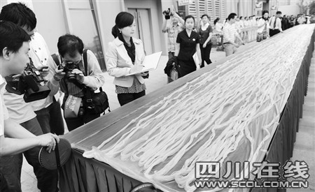 “哇!好長的米線!”昨日(26日)上午10點,成都萬達廣場臨時搭建的舞臺上,10名工作人員抬出了一個直徑為2米的大圓盤。圓盤上,一根長長的米線引起了圍觀者的驚呼。據(jù)悉,這束米線長度超過500米,將向現(xiàn)有最長方便米線的吉尼斯紀(jì)錄420.4米發(fā)起挑戰(zhàn)。