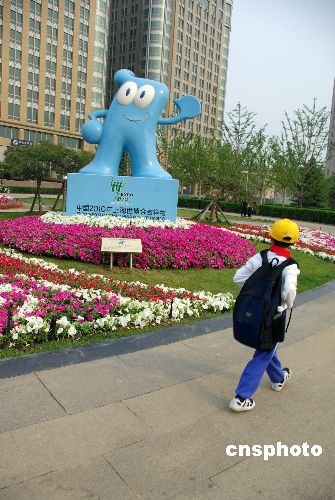 4月29日,中國2010年上海世博會(huì)吉祥物“海寶”和會(huì)徽花壇亮相北京長安街。2010年上海世博會(huì)吉祥物“海寶(HAIBAO)”,意為“四海之寶”,以藍(lán)色漢字的“人”作為核心創(chuàng)意。會(huì)徽?qǐng)D案以中國漢字“世”字書法創(chuàng)意為形,表達(dá)世博會(huì)“理解、溝通、歡聚、合作”的理念。中新社發(fā) 九州 攝