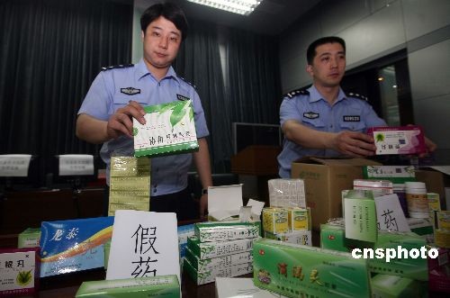 5月7日,北京宣武警方宣布:歷時(shí)兩個(gè)多月艱苦縝密的偵查,成功破獲了“2.19”特大制售假藥團(tuán)伙案,抓獲涉案人員140余名(其中刑事拘留處理131人),打掉分布于宣武、豐臺(tái)、通州3區(qū)的10個(gè)生產(chǎn)銷(xiāo)售假藥窩點(diǎn),截至目前已清查收繳120余種、重達(dá)10余噸的假藥和大量制假設(shè)備,收繳作案用車(chē)10輛。中新社發(fā) 湯亮 攝
