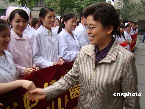 5月8日下午,來自四川省人民醫(yī)院、四川大學華西醫(yī)院、四川省腫瘤醫(yī)院等20余所醫(yī)院的醫(yī)務(wù)工作者,在抗震救災周年期間開赴災區(qū)進行為期10天的醫(yī)療衛(wèi)生服務(wù)。據(jù)了解,本次醫(yī)務(wù)工作者進災區(qū)開展醫(yī)療衛(wèi)生服務(wù)分為3個批次,將在都江堰、青川、北川等極重災區(qū)開展醫(yī)療義診、防疫保健、對口醫(yī)療技術(shù)職員以及抗震救災醫(yī)療衛(wèi)生系統(tǒng)先進事跡宣傳活動。圖為中共四川省委常委李登菊慰問即將開赴災區(qū)的醫(yī)療工作者。中新社發(fā) 王萌 攝