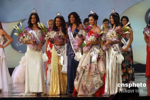 4月10日晚,2008國際旅游小姐冠軍總決賽暨頒獎(jiǎng)晚會(huì)在河南鄭州隆重舉行。秘魯小姐Silvia Vanessa (中)獲得本年度國際旅游小姐冠軍。代表中國參賽、浙江傳媒大學(xué)一年級的大學(xué)生童鶴(右二)和加拿大小姐Sahar Biniaz (左二)分獲亞軍和季軍。中新社發(fā) 慎重 攝