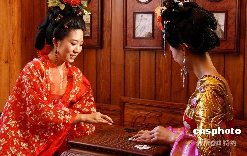 “國(guó)慶黃金周”之際,2008世界亞裔小姐大賽系列活動(dòng)在北京進(jìn)行展示,賽事活動(dòng)以中國(guó)文化和中國(guó)元素為表現(xiàn)主題,演繹“唐風(fēng)宋雅”女性風(fēng)采,通過(guò)展示中國(guó)盛唐時(shí)期的服飾美和造型美,從一個(gè)側(cè)面反映中國(guó)女性“浸于史、潤(rùn)于知、融于德、成于韻”的獨(dú)特氣質(zhì)與內(nèi)涵,選手盛裝出境,在中國(guó)古典家具的映襯下,分別從琴、棋、書、畫四個(gè)方面完美演繹了一幅幅頗具文化氣息的傳統(tǒng)仕女生活圖。中新社發(fā) 錢興強(qiáng) 攝