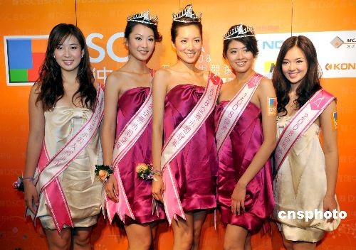 十二月十二日,二零零八亞洲小姐冠軍姚佳雯(中)、亞軍顏子菲(左二)、季軍賴琳恩(右二)及兩位友誼小姐姚鳳鳳(左一)、林淑蓉(右一)在香港出席二零零八亞洲小姐贊助商舉行的頒獎活動。中新社發(fā) 鄧慶樂 攝