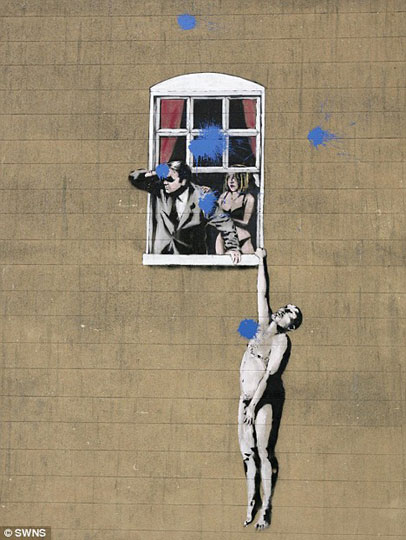 被彩蛋射擊污損的壁畫創(chuàng)作于2006年,描述的是一個赤裸裸的男人單手吊在房屋的窗口外,而他情婦的丈夫在屋內(nèi)尋找他。這幅壁畫現(xiàn)在已被人用6發(fā)藍(lán)色彩槍弄臟。