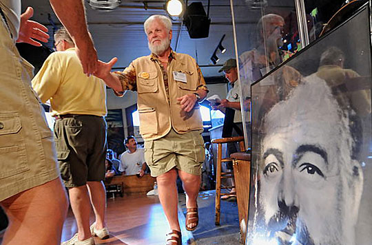 7月23日,“山寨”海明威大賽在在美國(guó)佛羅里達(dá)州海島小城基韋斯特的“邋遢喬”酒吧舉行。今年7月21日是海明威誕辰110周年紀(jì)念日。每年這個(gè)日子前后,海明威上世紀(jì)30年代曾居住過(guò)的佛羅里達(dá)州基韋斯特都會(huì)舉辦名為“海明威日”的系列紀(jì)念活動(dòng)。其中最著名的就是在“邋遢喬”酒吧舉行的海明威模仿大賽,評(píng)選模仿海明威衣著、神態(tài)最像的人。