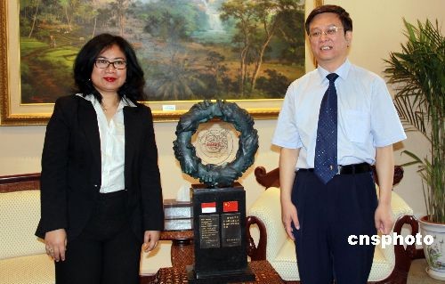 近日,“5·12”汶川特大地震一周年之際,中國(guó)人權(quán)發(fā)展基金會(huì)將其專門制作的青銅材質(zhì)“汶川地震國(guó)際救援致謝碑”,贈(zèng)送曾來(lái)華參加汶川地震救援的11支外國(guó)救援隊(duì)以表達(dá)謝意。圖為中國(guó)人權(quán)發(fā)展基金會(huì)副理事長(zhǎng)林伯承(右),將致謝碑送到印度尼西亞駐華使館。中新社發(fā) 任靖 攝