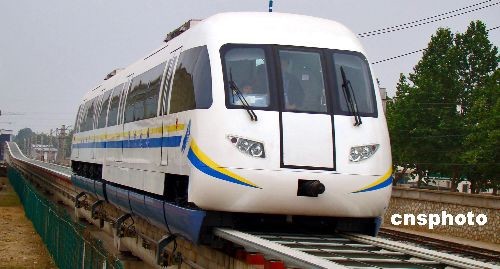 6月15日,中國首列具有完全自主知識產(chǎn)權(quán)的實(shí)用型常導(dǎo)中低速磁懸浮列車,在中國北車集團(tuán)唐山軌道客車有限公司下線并完成調(diào)試,開始進(jìn)行線路運(yùn)行試驗(yàn),標(biāo)志著中國已具備中低速磁懸浮列車產(chǎn)業(yè)化的制造能力。該列車為3輛編組模式,車體采用鋁合金與鋁蜂窩鉚焊混合超輕車體結(jié)構(gòu),流線型,全車各部件采用輕型、環(huán)保材料,內(nèi)部裝飾造型簡潔明快、舒適美觀,裝有空調(diào)、影音及廣播系統(tǒng)。運(yùn)行時速一般在120公里,使用壽命在25年以上。圖為試運(yùn)行中的中國首列實(shí)用型中低速磁懸浮列車。中新社發(fā) 翟羽佳 攝