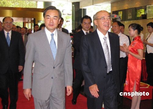 中國國民黨主席吳伯雄率參加第五屆兩岸經(jīng)貿(mào)文化論壇的中國國民黨代表團,7月10日下午乘臺北直飛的包機抵達湖南長沙黃花機場。中共中央臺辦主任王毅等到機場歡迎。第五屆兩岸經(jīng)貿(mào)文化論壇將于7月11日至12日在長沙舉行,論壇的主題是兩岸文教交流。中國國民黨、親民黨、新黨、無黨團結(jié)聯(lián)盟、部分民進黨人士,和眾多臺灣文化、教育、宗教屆和經(jīng)濟界代表與會。中新社發(fā) 傅煜 攝
