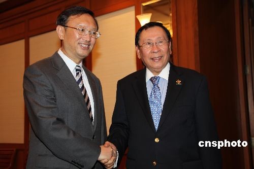 中國外交部部長楊潔篪(左)二十一日在泰國普吉會(huì)見了出席東盟地區(qū)論壇外長會(huì)的菲律賓外長羅慕洛(右)。雙方還就共同關(guān)心的國際和地區(qū)問題交換了看法。楊潔篪于當(dāng)日抵達(dá)泰國普吉,出席中國-東盟外長會(huì)、東盟與中日韓外會(huì)、第十六屆東盟地區(qū)論壇外長會(huì)和東亞峰會(huì)外長非正式磋商。中新社發(fā) 顧時(shí)宏 攝