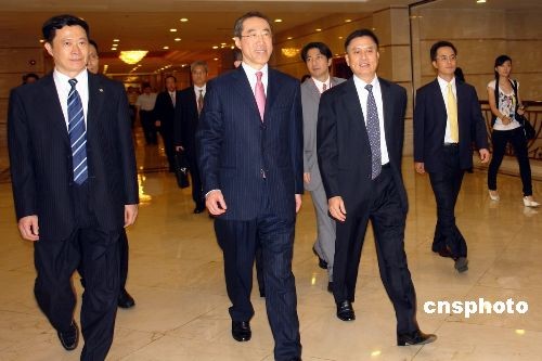 6月5日,香港特別行政區(qū)政務(wù)司司長(zhǎng)唐英年率五十余人組成的香港政府及工商界代表團(tuán)訪問(wèn)廣東江門(mén),與江門(mén)市委書(shū)記陳繼興、市長(zhǎng)王南健等市領(lǐng)導(dǎo)舉行座談會(huì),共同探討江港兩地在新形勢(shì)下加強(qiáng)合作的前景。據(jù)悉,江門(mén)是繼廣州、佛山和深圳后,香港代表團(tuán)巡訪考察珠三角九城市的第四站。中新社發(fā) 李健群 攝