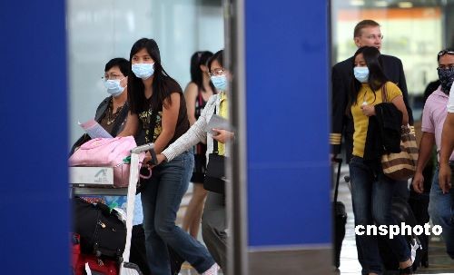 連日來,香港H1N1流感病例繼續(xù)增加,確診個(gè)案已突破一百宗。六月十五日,香港衛(wèi)生防護(hù)中心總監(jiān)曾浩輝表示,H1N1流感已跨區(qū)存在,相信其它區(qū)域也會(huì)出現(xiàn)個(gè)案,現(xiàn)時(shí)的個(gè)案屬冰山一角,相信一兩周,會(huì)有雙位增長。圖為抵港的旅客戴上口罩預(yù)防感染。中新社發(fā) 洪少葵 攝