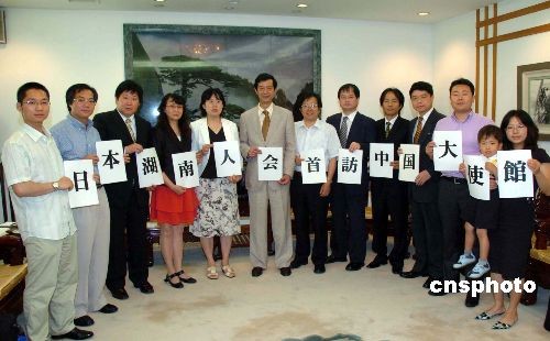 中國(guó)駐日大使館許澤友參贊兼總領(lǐng)事,7月2日下午在大使館會(huì)見(jiàn)了日本湖南之友會(huì)共同代表、日本湖南人會(huì)會(huì)長(zhǎng)段躍中一行,并和日本湖南人會(huì)的副會(huì)長(zhǎng)、理事們進(jìn)行了一個(gè)小時(shí)的座談。許澤友說(shuō),湖南有很深的文化底蘊(yùn),又有豐富的資源,發(fā)展?jié)摿艽蟆F诖谌蘸先藶榇龠M(jìn)家鄉(xiāng)、祖國(guó)與日本的交流方面起橋梁和窗口的作用。圖為日本湖南人會(huì)理事和許澤友總領(lǐng)事(左六)、劉敬師領(lǐng)事(右四)合影。中新社發(fā) 段躍中 攝