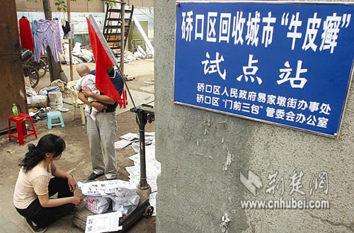 據(jù)硚口區(qū)“門前三包”管委會(huì)負(fù)責(zé)人楊璿介紹,普通廢紙的回收價(jià)格為每公斤0.3元,該試點(diǎn)站回收“牛皮癬”的價(jià)格則定為每公斤1元,為此,區(qū)有關(guān)部門決定給予其免交衛(wèi)生費(fèi)等項(xiàng)優(yōu)惠。此舉在國(guó)內(nèi)尚屬首創(chuàng),計(jì)劃在全區(qū)推廣。(王小晗 趙志宏 張梅 周波)